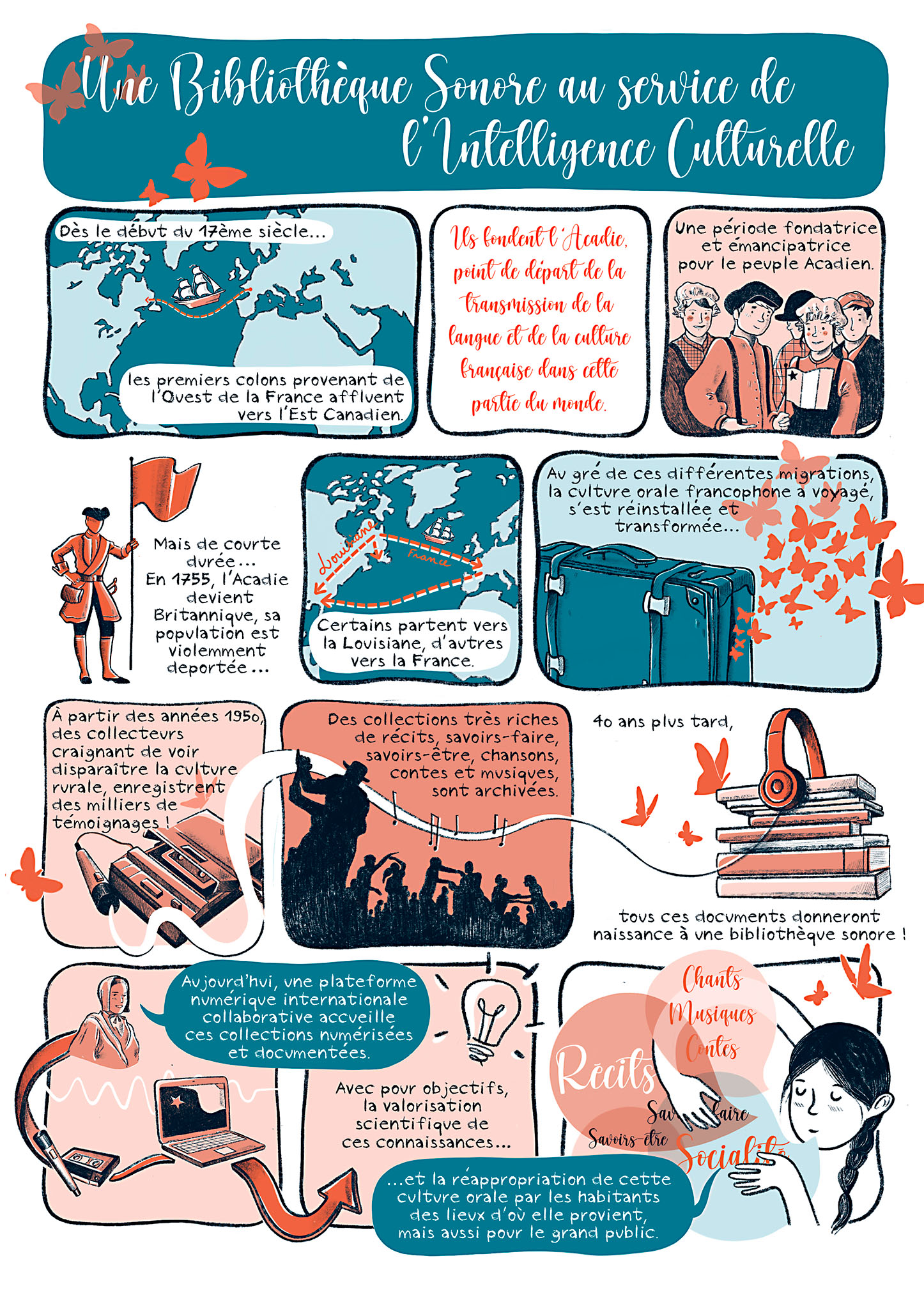 En parallèle de fonds traités dans leur intégralité, il est/sera procédé au repérage de certaines thématiques transversales pour une valorisation scientifique conventionnelle et/ou immédiate et originale : – le matrimoine (ce thème a déjà donné lieu à une table ronde en ligne avec nos partenaires) : 2 livrables sont envisagés : un livre illustré numérique + une résidence interdisciplinaire d’artistes qui s’inspireront de témoignages et performances de femmes sélectionnés dans les collections. ; – l’art de la fête (qui sera le thème d’une courte vidéo diffusée par Curieux.live) ; – le renouvellement des pratiques culturelles dans le temps et l’espace ( article court + interview à partir d’une thèse déjà soutenue : l’évolution du conte de Jean le Sot : Poitou, Acadie, Louisiane) ; – migration, réappropriation culturelle et vivre ensemble interculturel (séminaire international à la MSHS : approfondissement de collaborations en cours avec Lilyane Rachédi, UQAM, sur ce thème à partir des données de nos collections) ; ainsi que les thématiques suivantes qui seront proposées à l’étude dans le cadre du colloque de 2023 : savoir-faire liés à une socialité durable ; la mémoire de la bio-diversité ; l’identité communautaire (dans le sens nord-américain du terme) et construction du sentiment d’existence.
